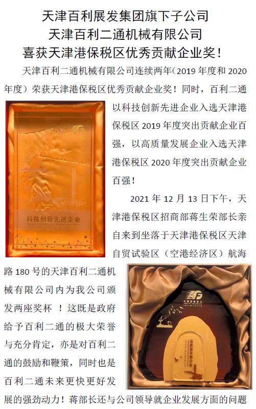 天津百利二通機械有限公司 喜獲天津港保稅區優秀貢獻企業獎
