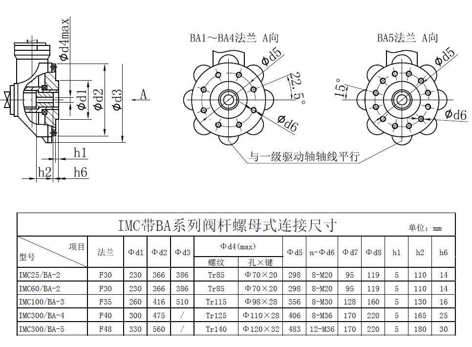 IMC/BA系列閥門電動(dòng)裝置是一種組合型多回轉(zhuǎn)閥門電動(dòng)裝置。它適用于閘閥、截止閥等類型的閥門。BA系列產(chǎn)品是可同時(shí)承受轉(zhuǎn)矩和軸向推力(通常稱為扭矩推力型)的圓錐齒輪閥門驅(qū)動(dòng)裝置。其傳動(dòng)型式可以滿足右旋手動(dòng)操作閥門為“關(guān)”的標(biāo)準(zhǔn)要求,結(jié)構(gòu)緊湊且大圓錐齒輪便于設(shè)置內(nèi)部有一定直徑的貫通孔輸出軸,可使明桿閥門的閥桿在開(kāi)啟時(shí)從輸出軸的內(nèi)孔伸出。BA系列產(chǎn)品可與中小轉(zhuǎn)矩規(guī)格的多回轉(zhuǎn)電動(dòng)裝置組合成為較大輸出轉(zhuǎn)矩規(guī)格的組合式多回轉(zhuǎn)閥門電動(dòng)裝置。