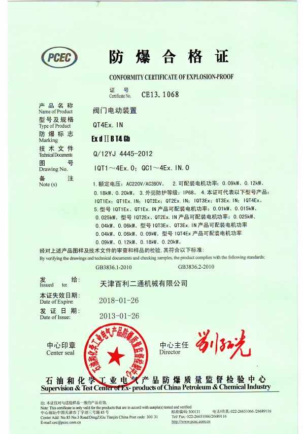 QT1~QT4 quarter-turn valve electric actuators are upgraded products developed by our company. They are applicable for controlling valves that make 90 degree turn, such as butterfly valve, ball valve and plug valve etc. The products have features like small size, light weight, high efficiency, high reliability, high protective property and low noise etc. The products can be operated on local place or controlled remotely.  The protective grade of the products is IP67 and the explosive-proof grade is ExdIIBT4
